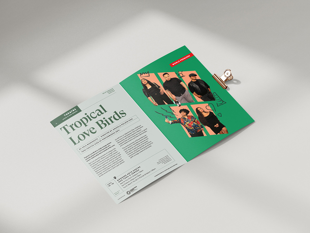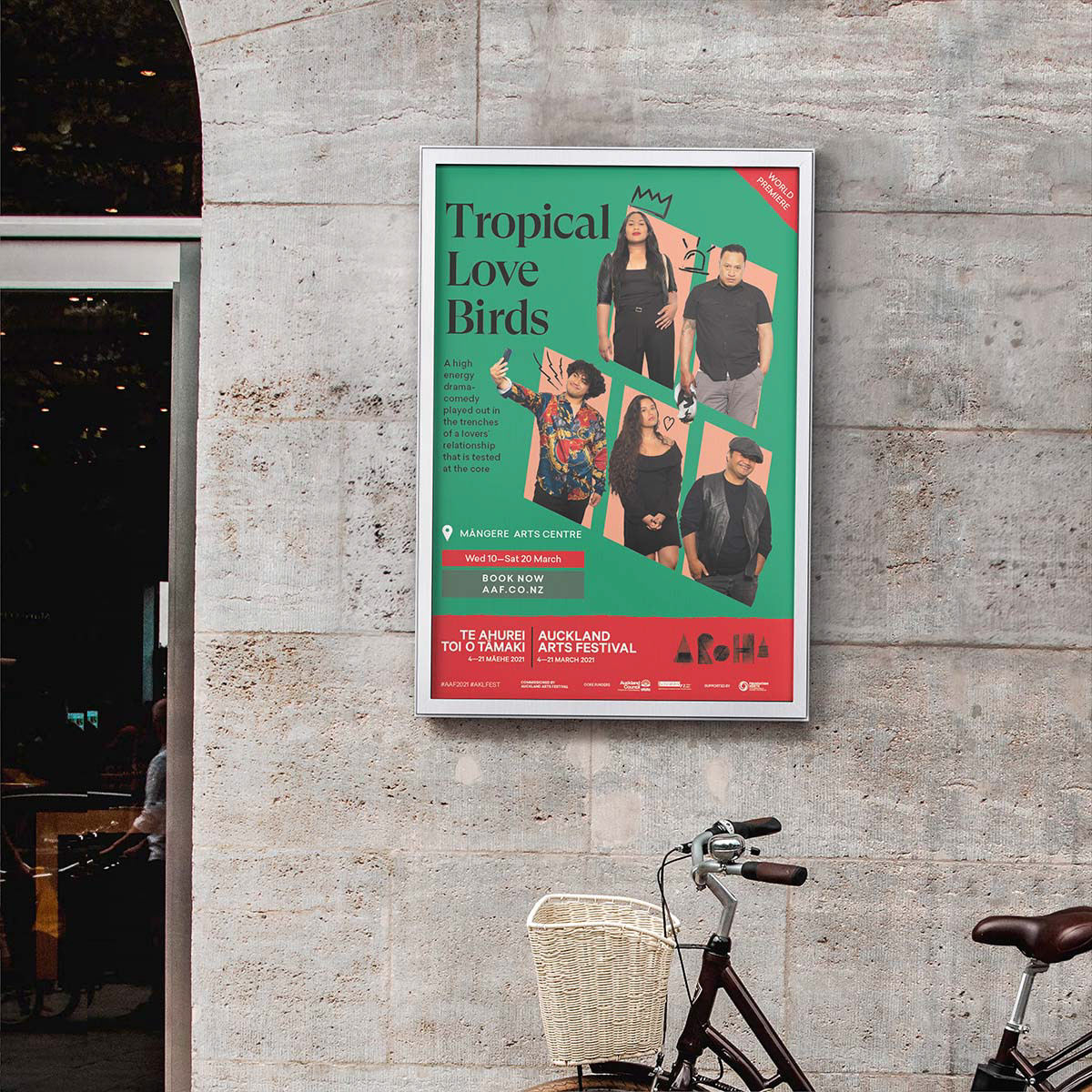 Afiche para la producción teatral, Tropical Love Birds, que se presentó en Auckland Arts Festival.